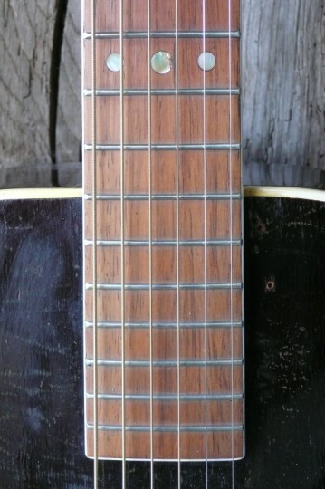 Orpheum Imperator archtops werden gemaakt in de eerste helft van de jaren '30 door Regal (Chicago, USA) voor groothandel Harry Stadlmair & Co in New York. Het waren high-end Archtops (in 3 stijlen A, B en C) beetje gemaakt naar het model van de Gibson L5. Gelamineerde gevlamd esdoorn 16 inch klankkast met spruce top. Vrij stevige v-vorm nek is ge'reset'.met. De (Honduras) Palissander toets is opnieuw gefret om hem weer goed bespeelbaar te krijgen. Ik weet niet helemaal zeker of het tailpiece origineel is maar komt zeker uit die tijd. Bovenkant brug heb ik getopt met been. Nieuwe butterbean tuners van Gotoh naar het origineel werken super fijn (de oude waren helaas te gammel). De lak heeft betere dagen gekend , flink wat krassen op deze oude dame. Geluid is best luid, droog, midrange, tikkie boxie. Evt te versterken met mooie dunne sixtus pickup zonder klankkast aan te tasten.