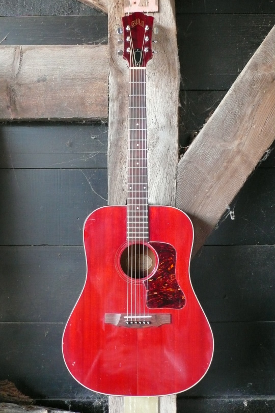 Deze Guild D25m cherry Bluegrass is gemaakt in 1970, Rhode island, USA (nr 46854). De hele klankkast zowel top als achter- en zijkanten zijn gemaakt van massief Mahonie. Deze heeft de gewone platte achterkant met balkjes ipv de gelamineerde ""arched" achterkant. De nek is gereset om weer een goede actie te krijgen van de snaren. Verder was er alleen lichte redress van de frets nodig om hem perfect bespeelbaar te krijgen ( met vrij smalle "slim" c-profiel hals, Rio Palissander toets 'by the way'). Rio Palissander zadel is voorzien van nieuw benen zadelbeen en ebben pinnen. Lak ziet er nog redelijk tot goed uit met de bekende butsen en kleine beschadigingen hier en daar. (op de foto is de cherry kleur roder dan in het echt). Een paar kleine barsten in de klankkast zijn gestabiliseerd (bijna niet te zien). De (Japanse) open tuners, celluloid slagplaat en trussrod cover zijn origineel. Simpele tuners werken nog goed maar kunnen evt worden vervangen als je toch een upgrade wil. Enfin vol, groots, woody geluid laat je oren overtuigen.
