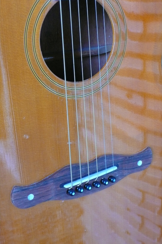Deze Harmony grand concert H181 is net als zijn broertje H167 maar 2 jaar gemaakt (1969 en 1970, Chicago, USA) en daardoor wat minder bekend dan de Harmony H162 Grand Concert. Deze is gemaakt in 1969 ( jaar stempel binnenin). De vorm van de klankkast (000-size) is wel precies hetzelfde. Ook de achter- en zijkanten zijn gemaakt van massief Honduras mahonie (de h167 heeft Berken klankkast). "Pumpkin coloured ladderbraced" top is van massief vuren (spruce) gemaakt. Opvallend is natuurlijk de Fender style kop en de palissander moustache pin brug (nieuwe ebben pinnen en beentje). Origineel verstelbaar plastic zadelbeen is vervangen door een vaste. De plastic verstelbare zijn toch een beetje "tone-killers". Originele zwarte Batwing slagplaat is er nog maar staat niet op de foto. Ook originele 6 op een rij tuners van Waverly werken nog prima wel altijd wat stug. Nieuwe nut gemaakt van been. Deze gitaar had (zoals gebruikelijk bij de Harmony's) een nek reset en een redress van de toets nodig maar speelt nu weer licht met een mooie rechte hals en een lage actie van de snaren. De nitro cellulose ziet lak er nog redelijk tot goed uit. Het geluid is vergelijkbaar met de H162 ( zelfde hout soorten): eerlijke directe, woody, ladderbraced blues klank