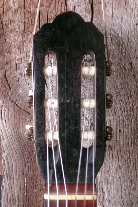 Waarschijnlijk is dit klassiek Spaans gitaartje gemaakt in Spanje voor de Engelse markt maar het zou ook Frankrijk of Duitsland kunnen zijn. Beetje af gaand op de mechanieken, stijl en "feel" schat ik hem jaren '30. Lastig echter om alles met zekerheid te zeggen want er is weinig over te vinden. Desalniettemin zeker een mooie gitaar met massieve spruce top, palissander zadel en toets. Hals is gemaakt van esdoorn die zwart gelakt is. Mooie patina van het vele spelen. De frets van de toets zijn opnieuw "gedressed" waardoor ie weer zonder aanlopen speelt. Ook heb ik een nieuwe benen zadelbeentje gemaakt. Duitse kwaliteits tuners uit de tijd werken nog soepel en precies. Enfin fijne kleine klassieke gitaar met best groot volume, gedefinieerd met droge sonore bassen. Gitaar is voorzien van Labella Pepe Romero snaren. Originele Engelse Hardcase koffer zit er ook nog bij en is in redelijk goede staat